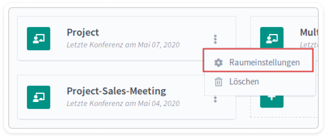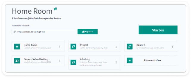 In the main menu, you can see the conference rooms you have created. It makes sense to create your own rooms for different purposes, groups, or clients and use them repeatedly. These rooms are like a meeting space or workspace.